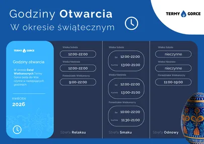 Drodzy Klienci! Aby ułatwić Wam organizację wypoczynku, przedstawiamy godziny otwarcia Term Gorce w okresie wielkanocnym. Sprawdźcie, kiedy poszczególne strefy są dla Was otwarte i zaplanujcie swój relaks! ✨