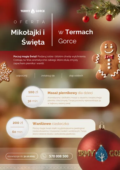 Choć grudzień to czas przygotowań do świąt, nie zapominajcie o chwili dla siebie! W Termy Gorce czeka na Was wyjątkowa oferta, która pozwoli Wam zwolnić tempo i dosłownie zanurzyć się w świątecznym aromacie piernika i słodkiej wanilii! 🎅