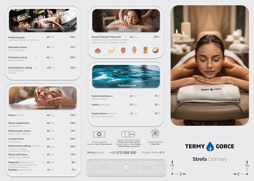 Witamy Cię w Strefie Odnowy Term Gorce! Znajdziesz tu szeroki wybór usług pogrupowanych na 7 kategorii.